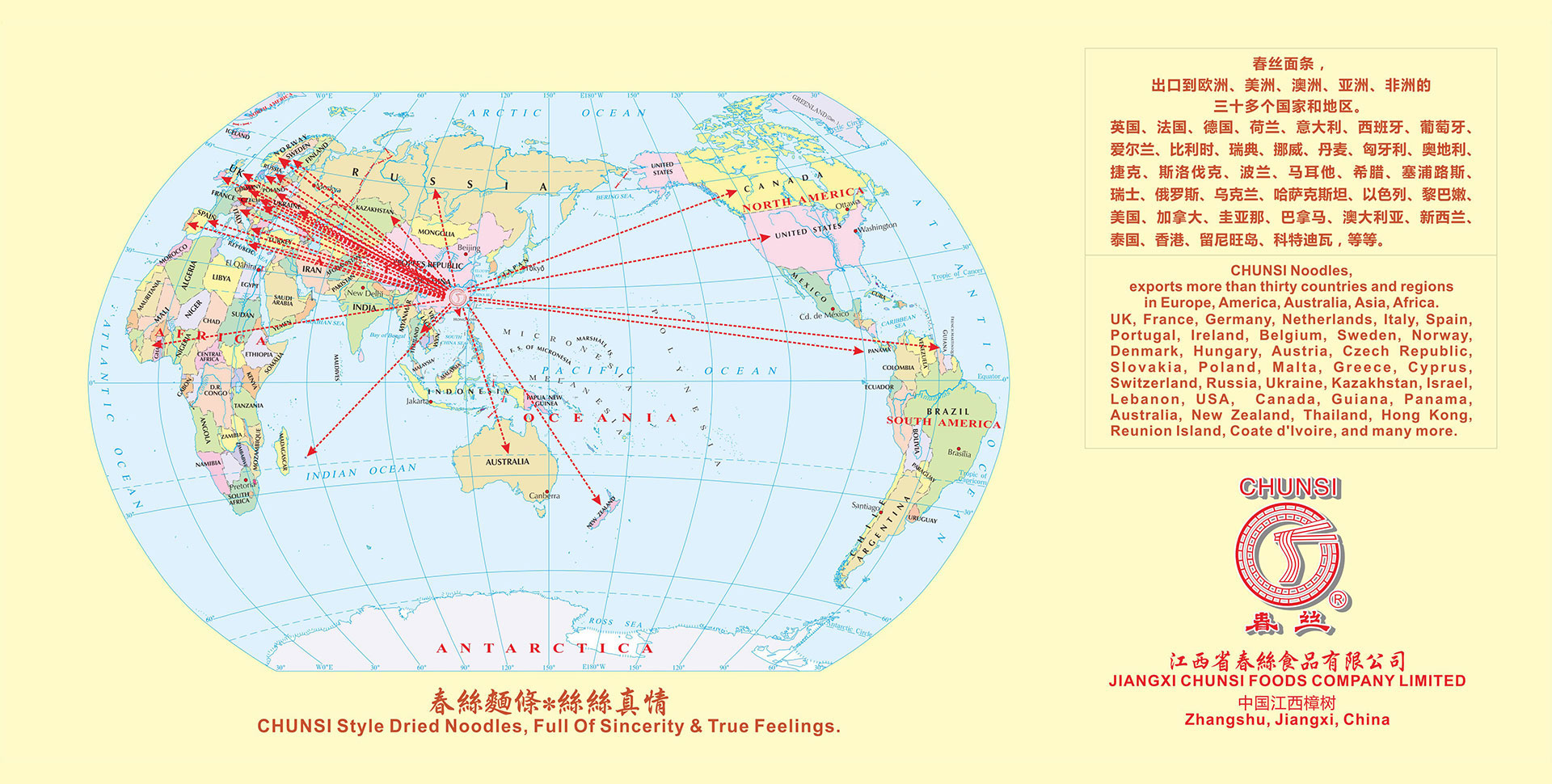江西省春絲食品有限公司位于江西省樟樹市。 樟樹具有制作面條的悠久歷史傳統。古來即有民謠:“臨江府、清江縣(即樟樹),六歲伢仔會做面。” 今春絲公司是江西省內具有規模的面條、米粉加工企業,也是全國知名的面條生產企業。春絲公司現擁有“春絲”、“凌波仙子”、“絲絲?!?、“春佳”四大品牌,一百多個品種。所有面條、米粉產品均選用合格原料,符合國家質量和衛生標準。產品具有安全健康、面體勁道、柔韌爽滑、易熟、久煮不糊、不渾湯等特色,深受廣大消費者歡迎。春絲產品已全面進入沃爾瑪、家樂福、樂購、歐尚、好又多、易初蓮花等大型超市,并遠銷美國、日本、英國、德國、法國、西班牙、意大利、葡萄牙、香港等二十多個國家和地區。
